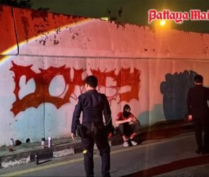 Russian teen caught spray-painting Pattaya’s Laem Bali Hai Bridge wall, one friend escapes