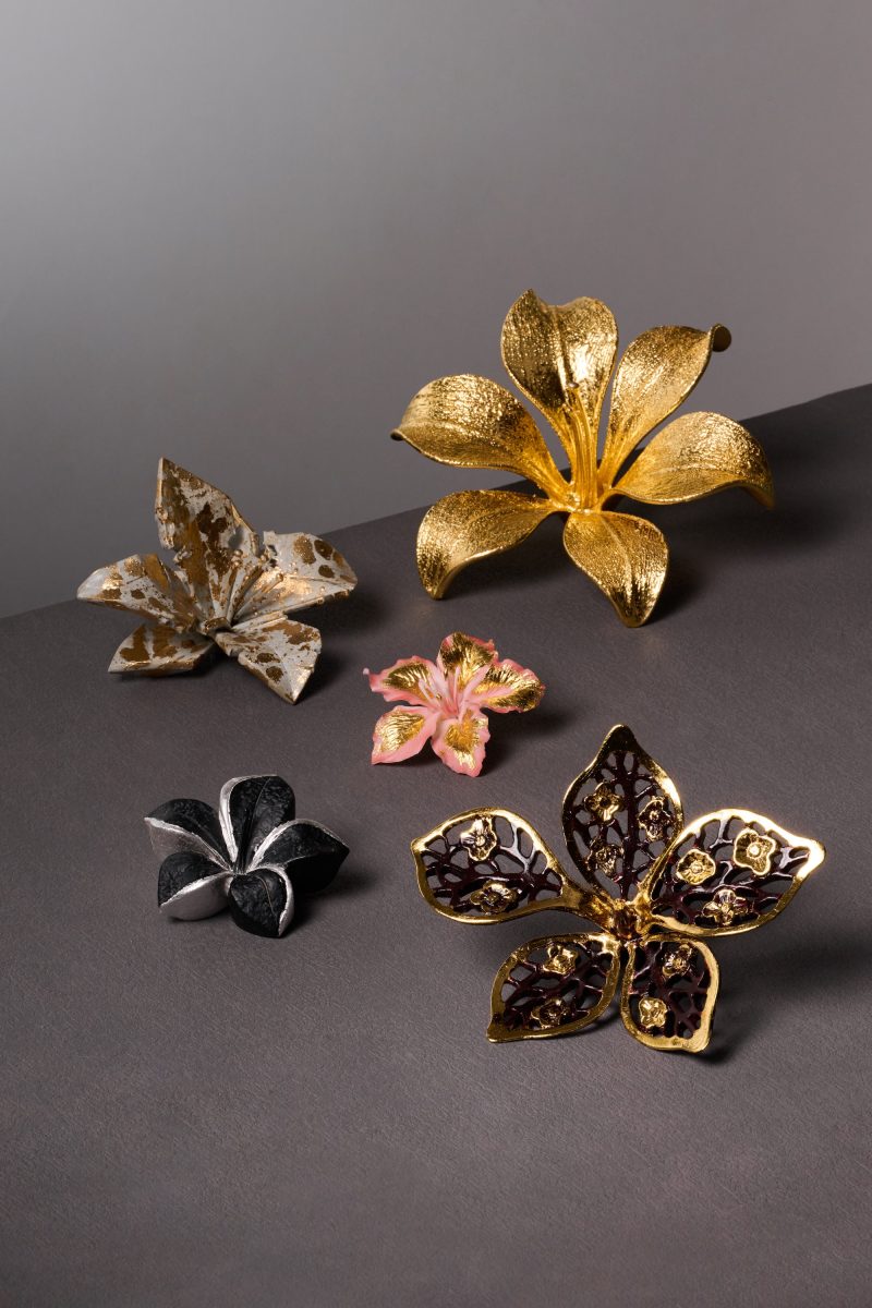 Elsewhere, gold gilding is reimagined through a dialogue between Anson Lai and the Cheung Lee Wood Carving and Gilding Works Co., whose lineage stretches back generations. Drawing inspiration from Hong Kong’s Forever Blooming Bauhinia monument, they present a series of sculptural flowers that merge traditional techniques with contemporary fabrication, their surfaces shifting between metal, stone and something more ambiguous.