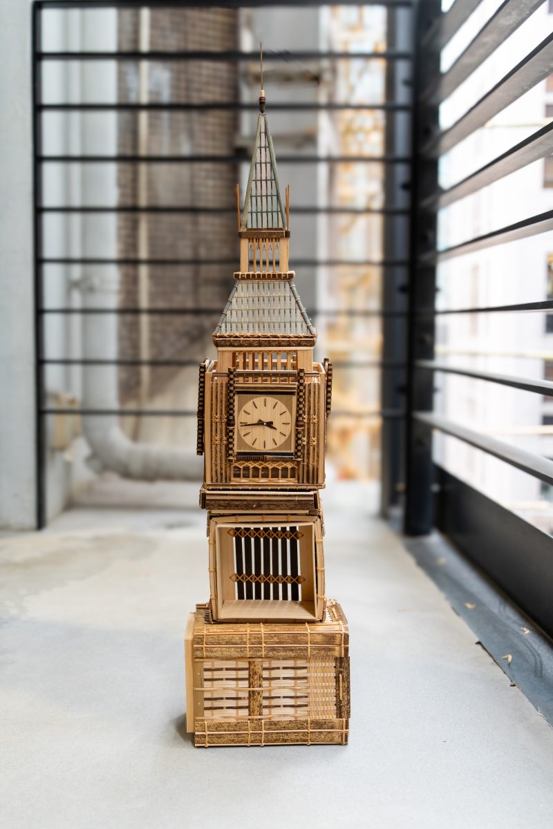 The exhibition closes with a quietly playful gesture: a bamboo interpretation of Big Ben by artist Inkgo Lam. Built using techniques traditionally associated with bamboo steamers, the structure becomes a cross-cultural object — part architectural model, part sculptural translation — collapsing London and Hong Kong into a single material language.