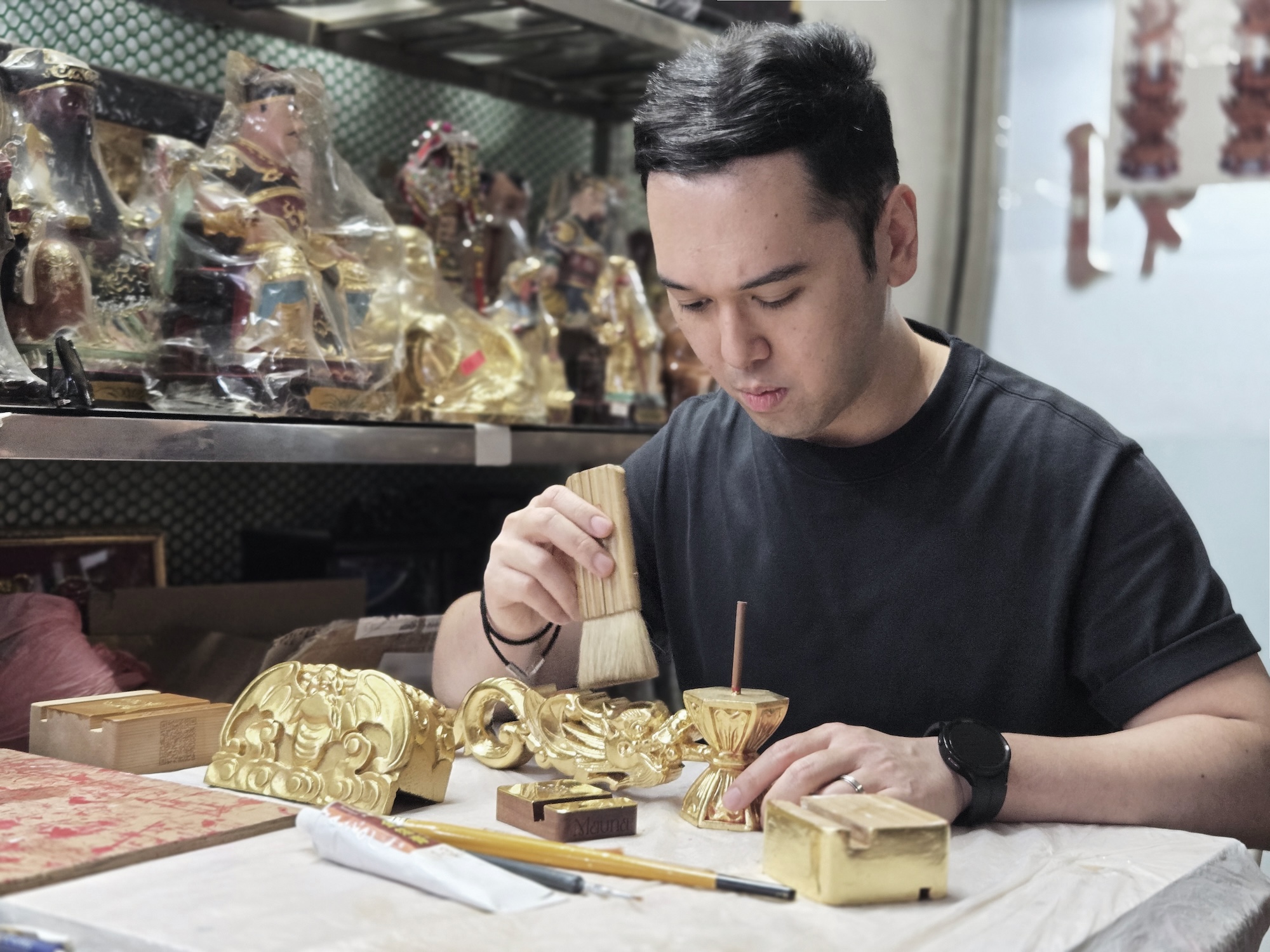 gold gilding at Wong Sum Kee, a distinguished Buddha statue workshop. He later founded his own establishment, Cheung Lee, which has now endured for more than 50 years, dedicating its expertise solely to the application of authentic gold leaf onto wooden objects. Today, Cheung Lee is helmed by the founder’s wife, Mrs. Wong, and the second-generation brothers Wong Yin Fat and Wong Yin Bong. Wong Yin Fat trained under his father for over 20 years and has truly mastered the craft. Cheung Lee was entrusted by the Hong Kong Government with a significant honour: regilding the Forever Blooming Bauhinia Sculpture 4 times between 2000 and 2018.