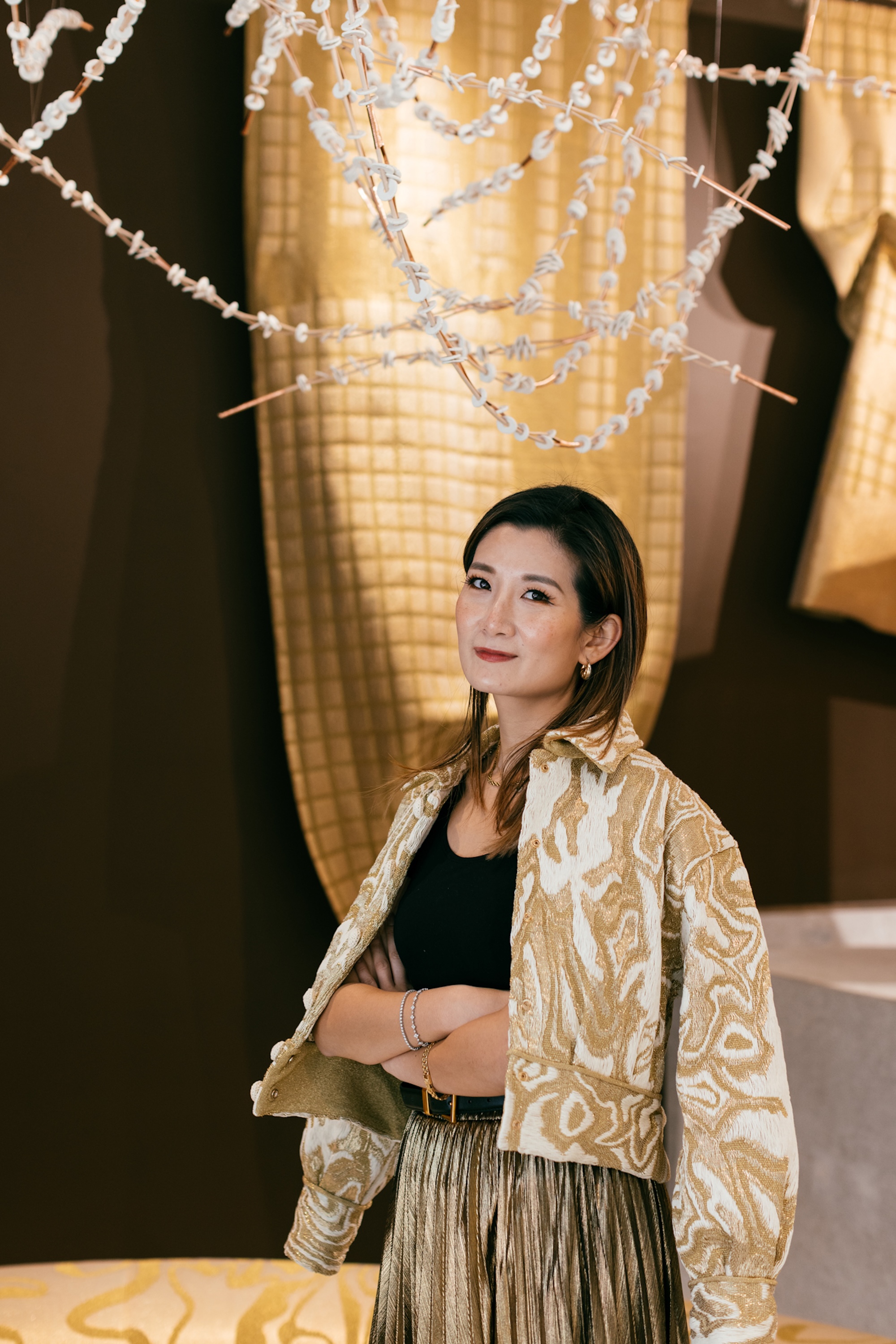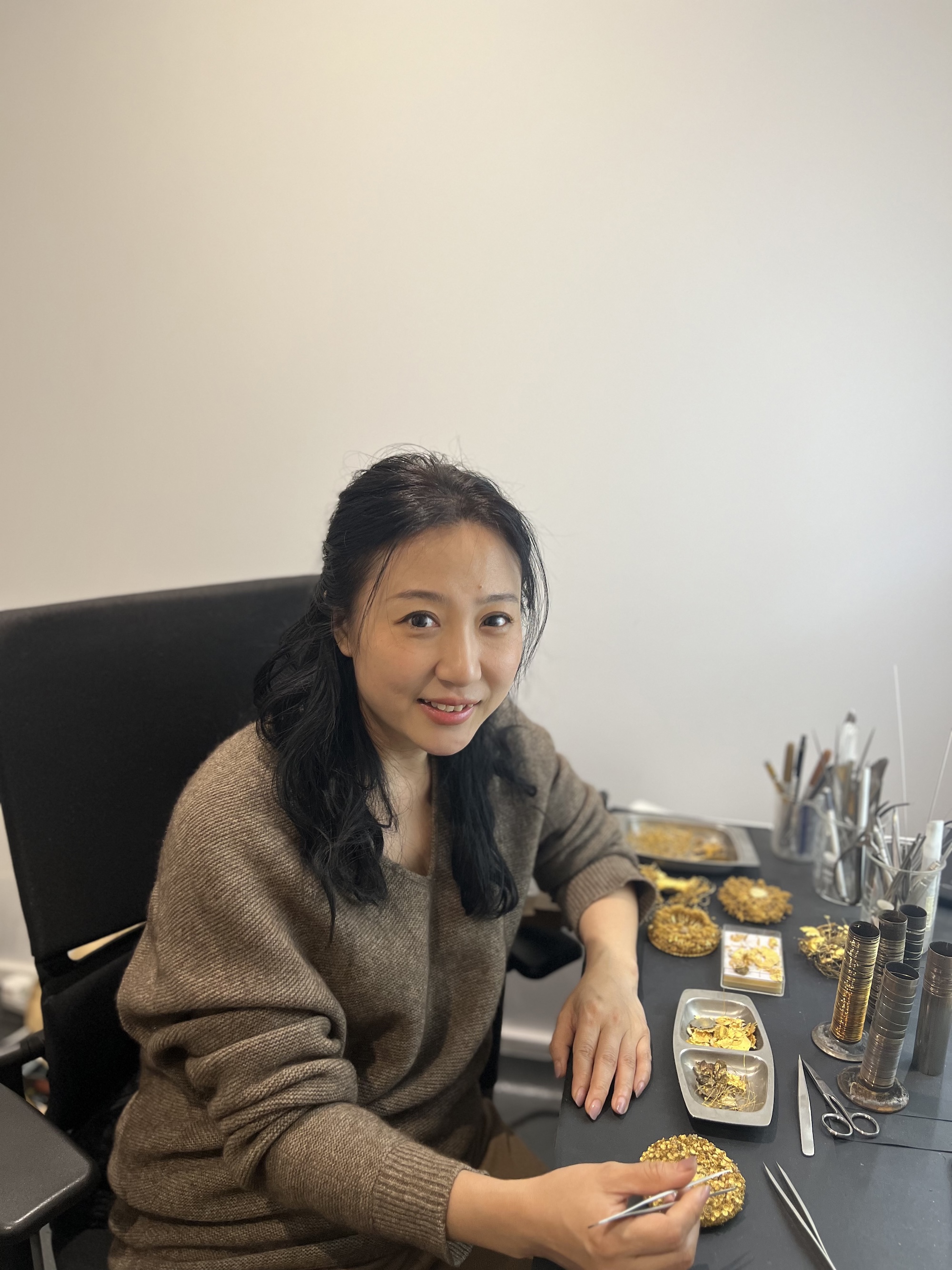 Huimin Zhang is an artist deeply passionate about collecting antique jewellery, with over 17years of experience amassing a collection of more than a thousand antique metal pieces. This extensive background has fostered her profound interest in traditional craftsmanship. Sixteen years after earning her undergraduate degree in Product Design from the Central Academy of Fine Arts, she pursued further study at the Royal College of Art in London, specialising in Jewellery and Metal Design. Zhang uniquely integrates diverse cultural techniques, such as Chinese filigree and European gold and silver embroidery, to develop an innovative method resembling “gold moss.” She believes that blending multiple crafts is essential for preserving traditional skills. Currently, Zhang focuses on working with 22K gold and has even customised her own wire-drawing tools to efficiently produce ultra-fine0.07mm22K gold threads