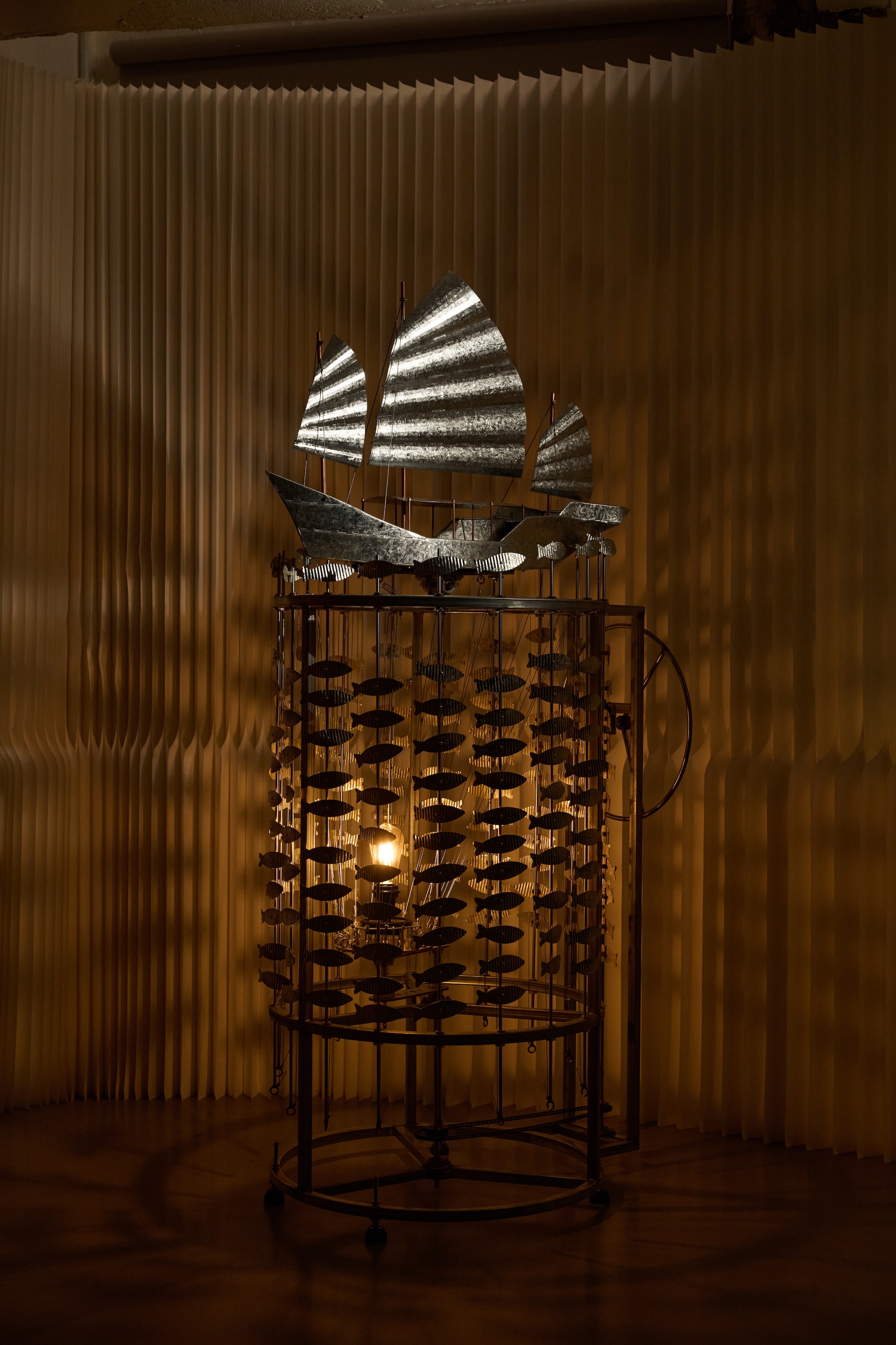 Industrial material finds a new voice in Naam Yu’s kinetic galvanised-iron installation — a junk boat that moves between metaphor and memory, tracing Hong Kong’s transformation from fishing village to global city. Developed in collaboration with master craftsman Michael Yu, the work combines hand skills with digital fabrication, bridging analogue and contemporary production.