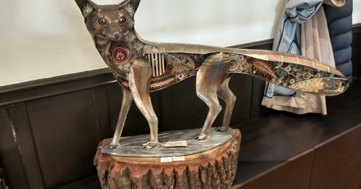 Entering the hall, I was immediately confronted by Darren Allsopp’s show-stopping metal sculptures. His “Brockelsby Fox” was a life-size fox made of steel from HMS Brocklesby, its innards cut open to reveal dried plants and flowers – a stunning creation: art as environmental commentary, perhaps?