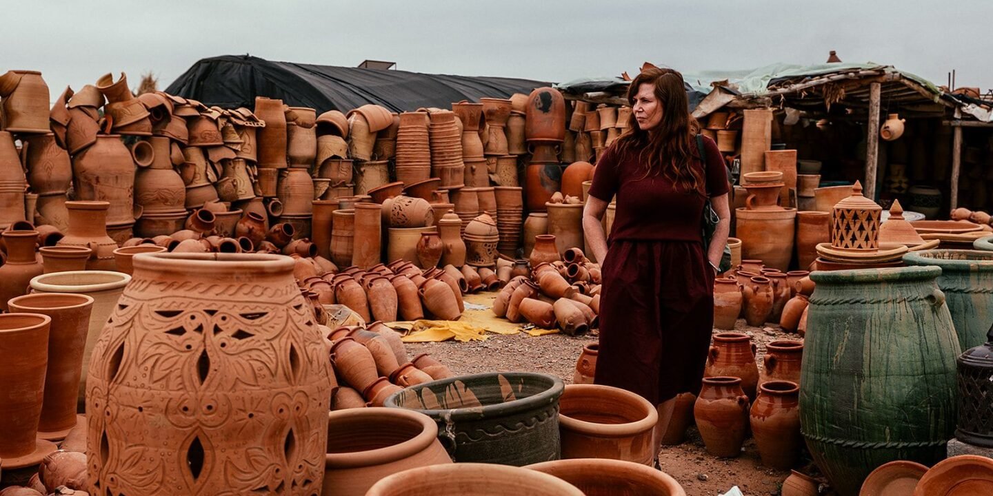 Peake finds every product by travelling: tapestries by Gujarat weavers, Oaxacan clay objects, and glass plates inspired by the slow flow of fog through Osaka. For her latest collection, she travelled to Morocco, where she discovered sustainably harvested prickly pear oil, ancient Tadelakt pottery, and naturally dyed Moroccan rugs that seem to have soaked up the shifting amber light of the desert.
