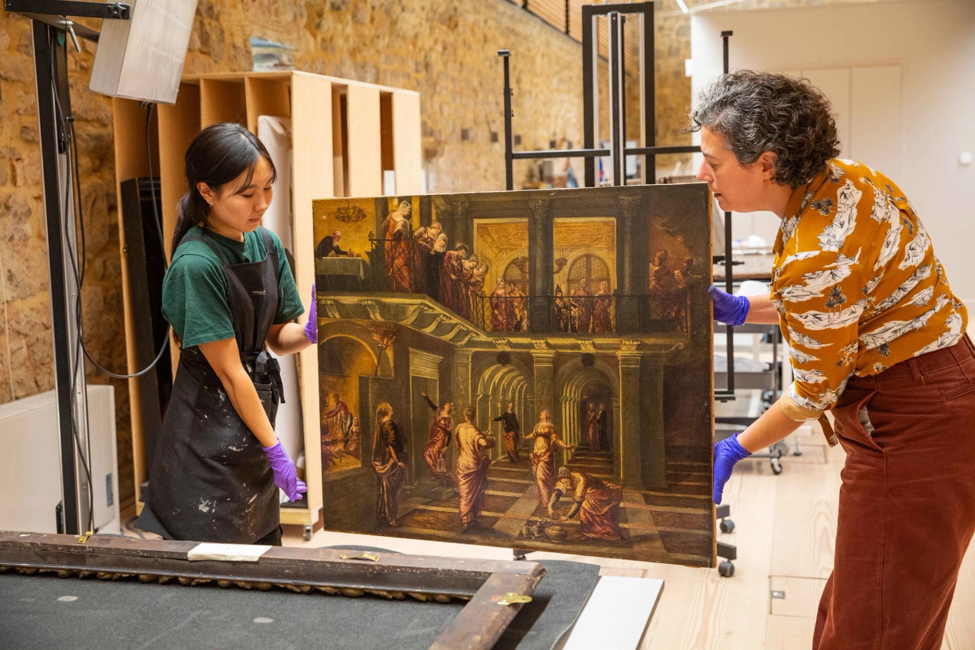 In fact, this latest conservation project has revealed, these features were pentimenti. Close examination of the original paint layers showed that Tintoretto had initially painted criss-cross elements but removed them, only for these features to became visible once again through increasingly translucent, ageing paint layers, exacerbated by previous harsh cleaning. Conservation work has returned this section of the painting closer to how Tintoretto intended it, honouring his pentimenti by using in-painting to reduce the visual impact of the criss cross elements.