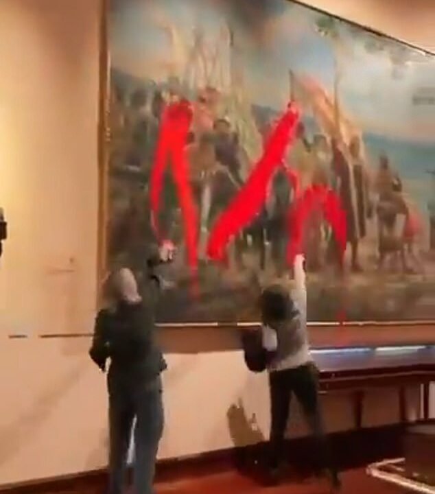 A small gathered crowd shouted at them as they chucked the paint over the artwork, which depicts Columbus landing in the New World in 1492.
