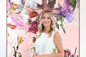 DEVIN B. JOHNSON, “The Four Heartstrings,” 2024 (oil and spray paint on linen, 60 x 62 inches / 152.4 x 157.5 cm). | © Devin B. Johnson. Courtesy the artist and Nicodim. Photo by Yubo Dong / ofstudio photography