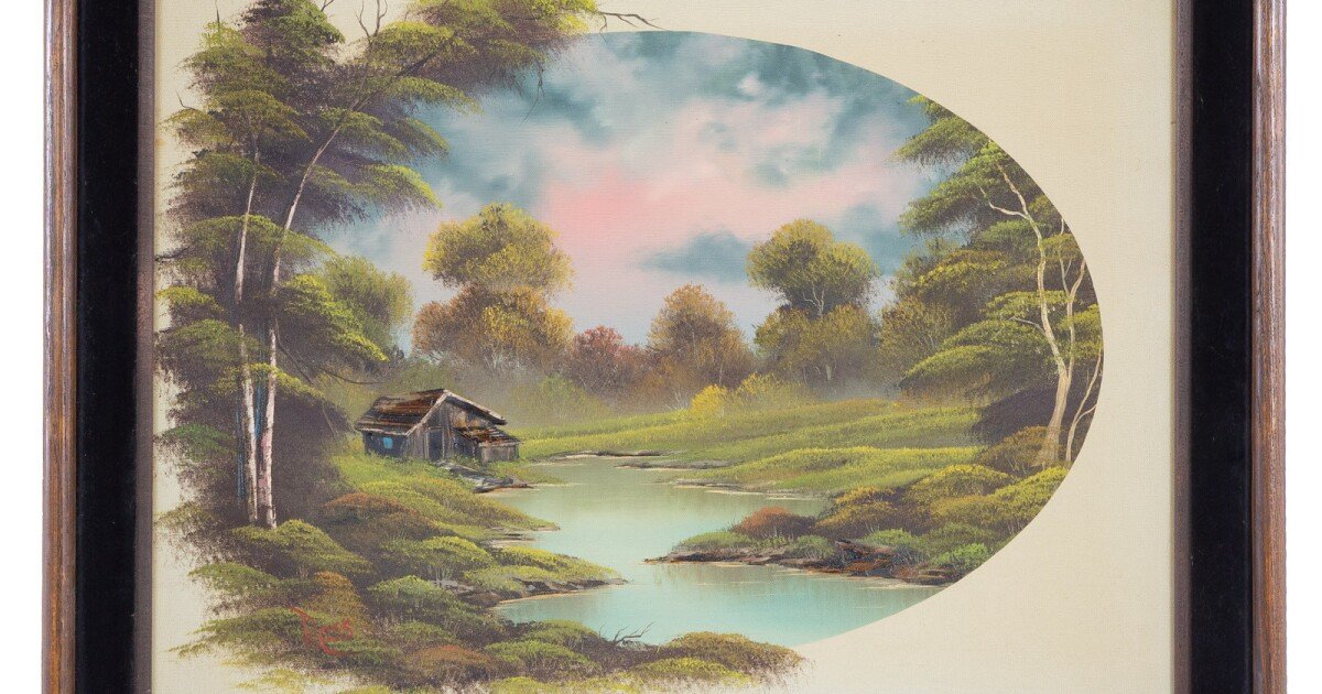 The painting, titled “Lake with Cabin and Trees,” showcases Ross’s signature peaceful style featuring a cozy cabin nestled by a lake and surrounded by towering trees. What makes this piece particularly special is a handwritten note on the back where Ross gifted it to a couple, wishing them “a very happy and joyful life.” The painting is signed on both sides.