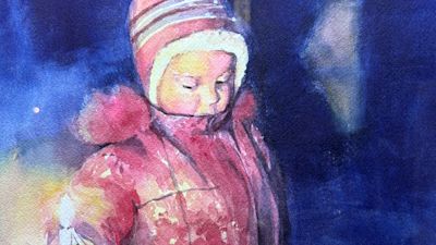 She mainly paints versions of war photographers’ work but occasionally she’s sent photos from people living through the war – like Eva.