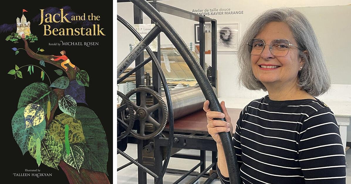 Children’s books have also been a fun and creative way to showcase her printmaking skills. She recently partnered with author Michael Rosen in the UK for a reinventing of the popular story, Jack and the Beanstalk (Tradewind Books). It’s their second book together. Their first was Aesop’s Fables. “Much in the same vein of Aesop’s Fables, it combines acrylic paint with handprinted texture on a black background,” Hacikyan explained. “In preparation, I did a lot of free sketching without thinking of the specific scenes. One thing that was unique about this book was that I have a vegetable patch in my backyard, so I decided that I wanted to grow my own bean plants. When they were mature, I sketched and photographed them, and I picked the beans and drew them. I wanted the beanstalk to be very present in the illustrations and to convey the feeling of what it’s like to climb up and discover it, but also come down in a huge, big rush with this treasure from the castle trying not to get caught. The beanstalk becomes an important character of the story. I wanted to add a touch of realism to this fantasy look of the whole book.” The book is on sale at all major bookstores and online.