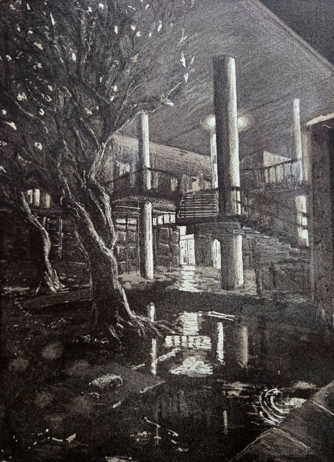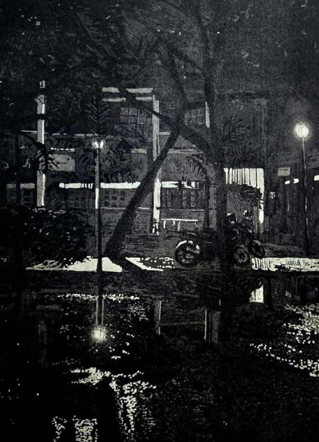 His amazing control over tonal gradient and play with light demands the audience to observe the art deeply. A French critic once said, “Fawaz’s art is like a night scene from a nouvelle vague movie…elegantly frozen in time.” And Fawaz quotes, “Intaglio printmaking requires endless hours inside a dirty studio. Many people come, but only a few obsessive, perfectionist crazies stay. Because this world of intaglio can create unimaginable beauty.”