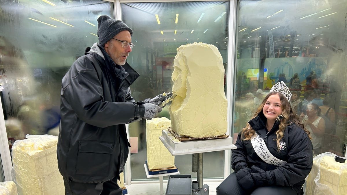 Kulzer takes a 90-pound block of food-quality butter and carves it up into the head of one of the nine princesses each year. The princess sits in the refrigerated unit for around seven hours, posing for her bust.