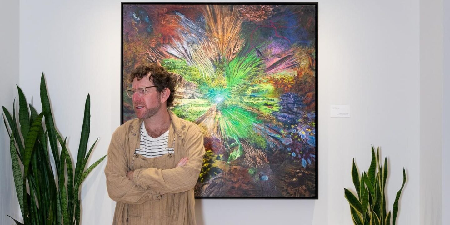 Dustin Yellin in front of Werner’s Crater (2025) at Lutron in New York