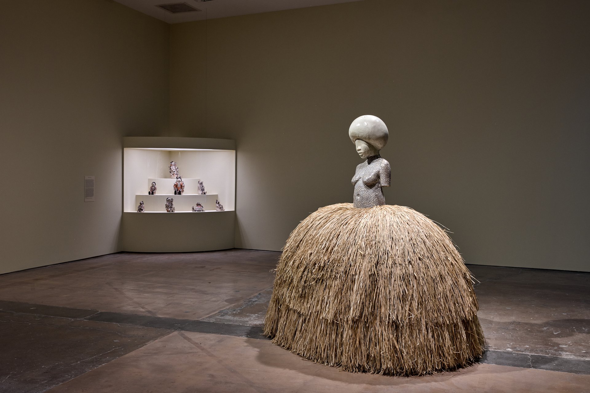 Installation view of Once Within a Time, with Helen Cordero’s Storyteller figurines (left) and Simone Leigh’s Untitled (2025)