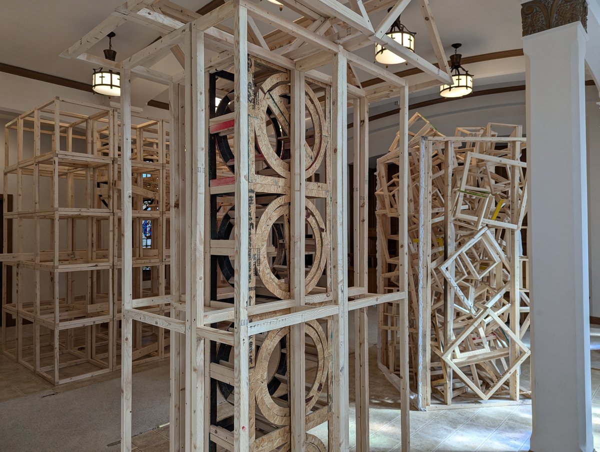 A series of structures from artist Peter Manion make up Open Window’s largest installation. Constructed from pinewood boards, the pieces resemble the skeletons of buildings featuring broken parts, blocked components, and crowded, overlapping elements.